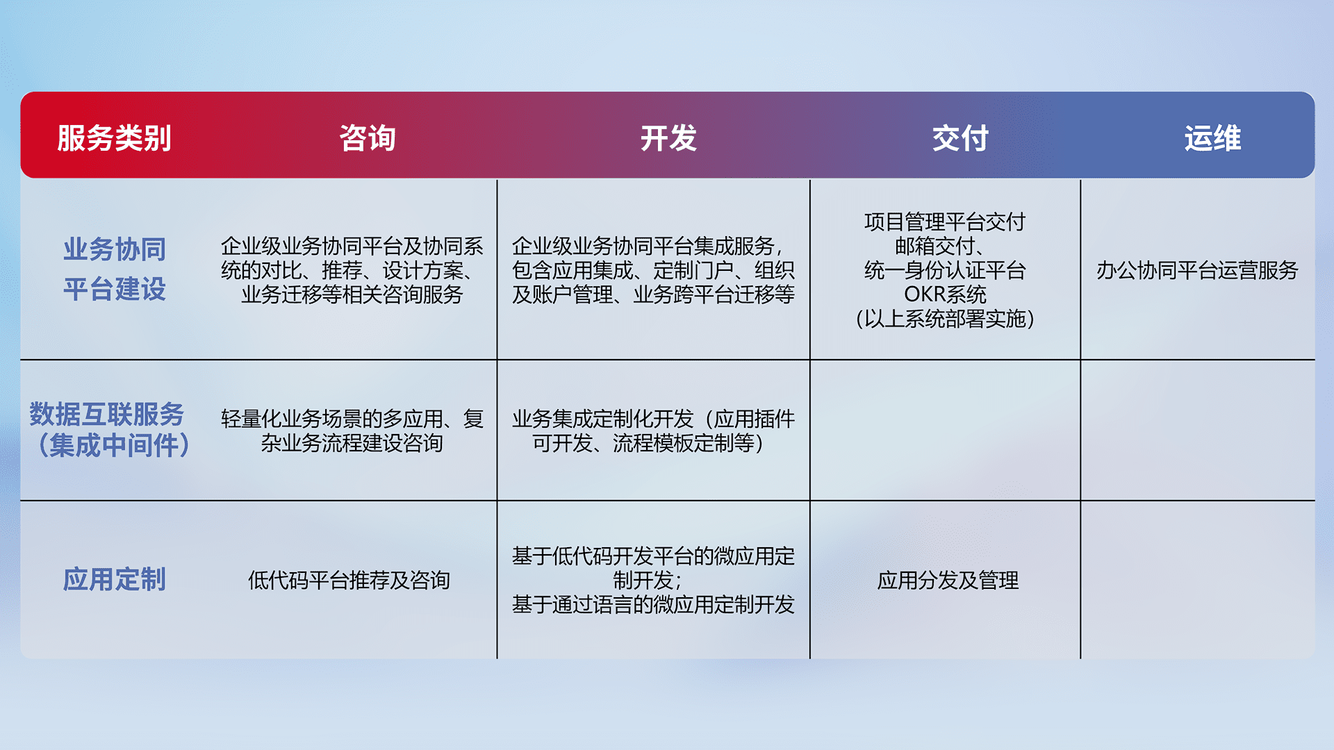 针对钉钉、、、、企微、、、IDaas等平台级产品提供产品的规划、、方案、、、交付、、、、定制化开发等服务,,,实现如统一协同办公、、、、智能客户服务、、、、混合会议管理、、、、智能数据查询、、、、等业务场景,,实现数字化转型。。。